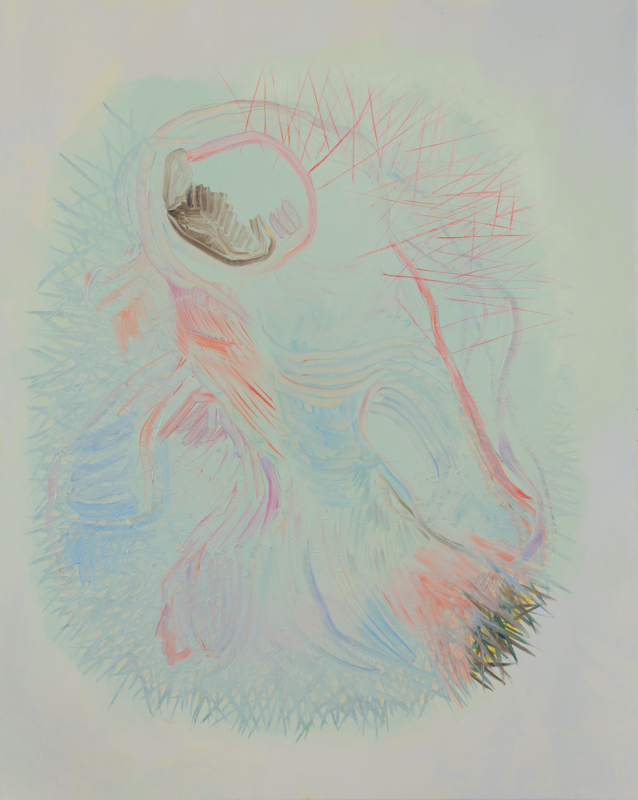 A l’occasion de l’exposition individuelle que lui consacre Jola Sidi Gallery, Dorota Buczkowska présente la dernière série de ses peintures intitulée Chatouiller le palais (2013). Dans cette série, gaie, lumineuse et charnelle, elle met à profit de façon remarquable ses compétences de restauratrice d’œuvres d’art par l’utilisation de techniques de peinture ancienne. On y retrouve ce lien ténu entre des formes construites et irréelles et la nature, aussi bien que l’état de mutation : une phase difficilement identifiable entre début de sa formation ou sa décomposition. Ses tableaux sont accompagnés aussi de quelques dessins et collages de la série Écosystème (2013-2014) dans laquelle l’artiste puise dans son œuvre en « recyclant » ses anciens travaux. Telles des planches arrachées à une encyclopédie imaginaire des sciences naturelles, elles représentent des organismes mutants et difformes ou bien une substance fluide, brillante et velue par endroits, mais toujours embellies par le geste gracile de l’artiste. L’aspect organique et mutant de ces dessins est obtenu grâce à l’idée insolite de l’artiste d’utiliser du maquillage qui imbibe progressivement le papier laissant le temps faire resurgir l’inattendu, taches de graisse donnant au papier la texture d’une peau translucide…